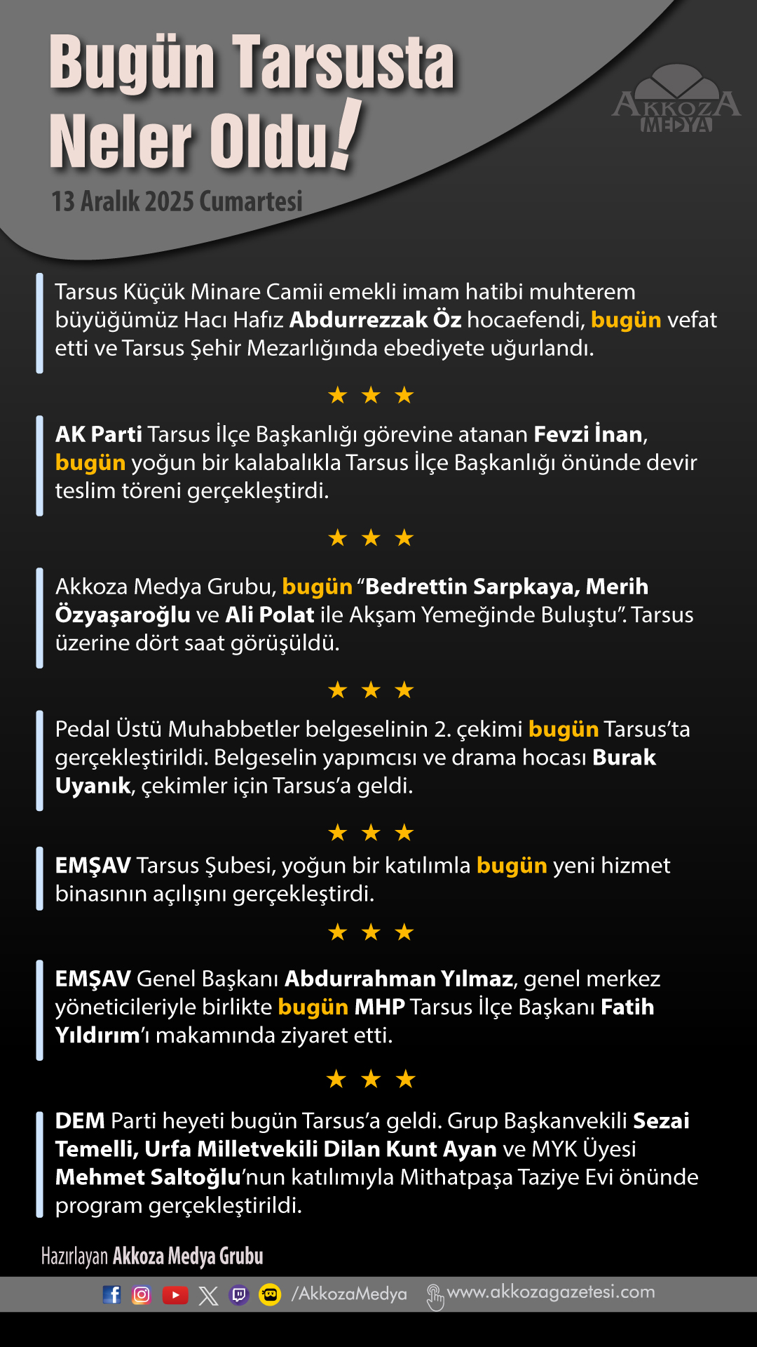 13 Aralık 2025 Cumartesi – Bugün Tarsus’ta Neler Oldu?