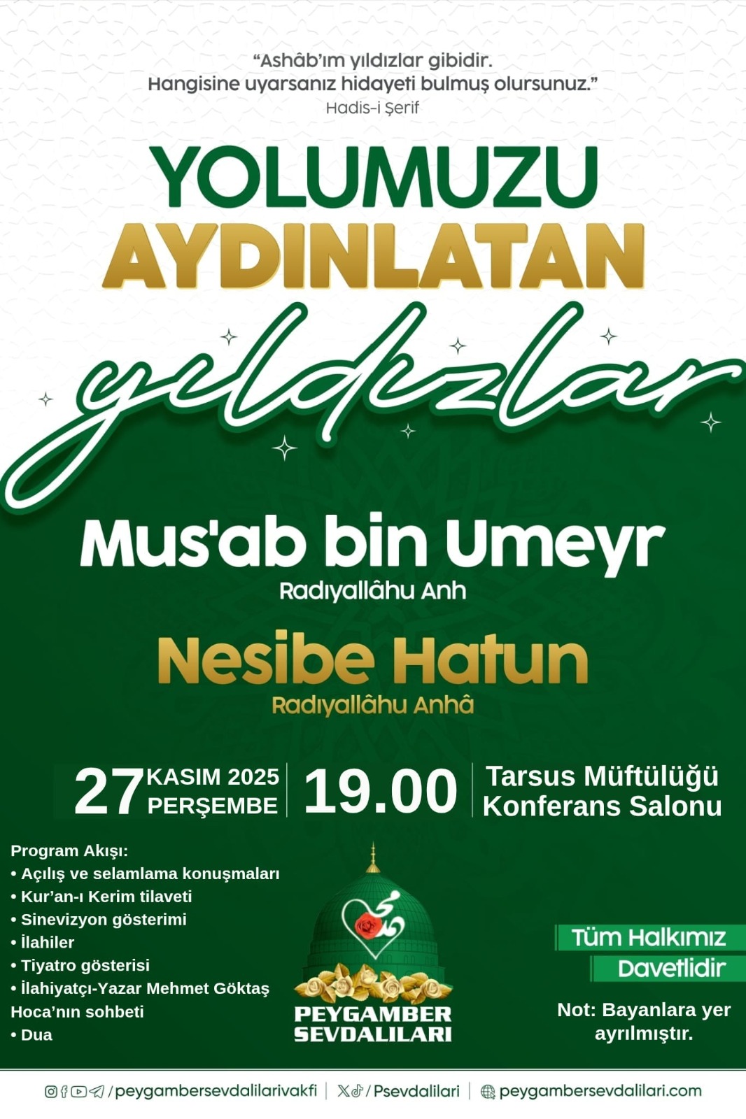 Peygamber Sevdalıları Vakfı Tarsus Temsilciliği, sahabenin örnek hayatlarının anlatılacağı özel bir program düzenliyor. “Ashâbım yıldızlar gibidir, hangisine uyarsanız hidayeti bulursunuz” hadis-i şerifinin ışığında hazırlanan programda, Mus’ab bin Umeyr (r.a.) ve Nesibe Hatun (r.anha)’nın hayatı ele alınacak.