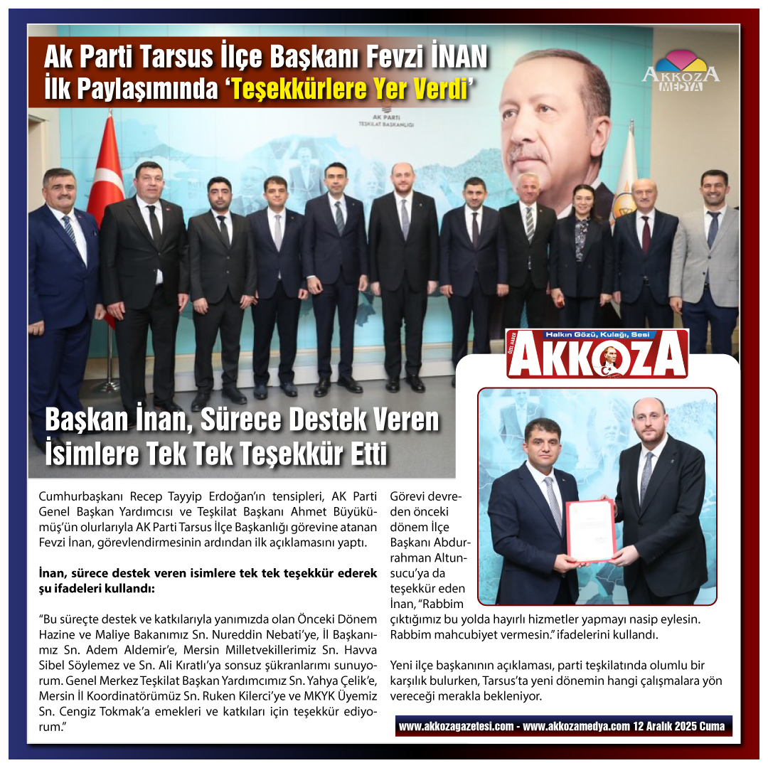 Ak Parti Tarsus İlçe Başkanı Fevzi İnan İlk Paylaşımında ‘Teşekkürlere Yer Verdi’