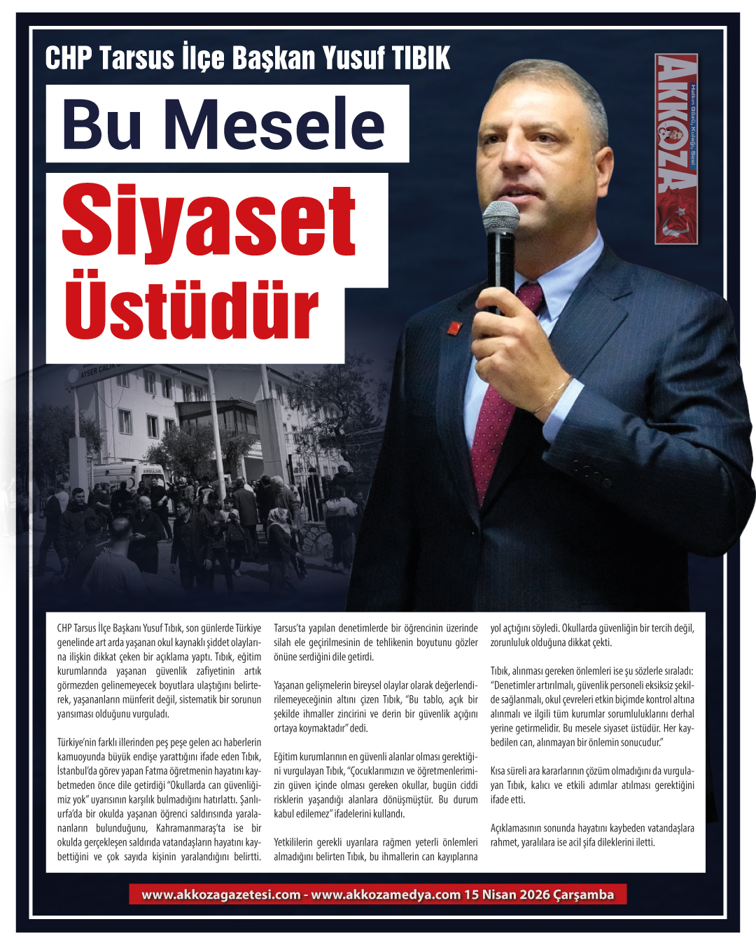 CHP Tarsus İlçe Başkanı Yusuf Tıbık, son günlerde Türkiye genelinde art arda yaşanan okul kaynaklı şiddet olaylarına ilişkin açıklama yaptı. Tıbık, eğitim kurumlarındaki güvenlik zafiyetinin artık görmezden gelinemeyecek boyutlara ulaştığını belirterek, yaşananların münferit değil, sistematik bir sorunun yansıması olduğunu ifade etti.