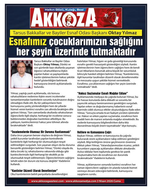 Okul kantinlerinin belirli periyotlarla denetlendiğini hatırlatan Yılmaz, hijyen ve gıda güvenliği konusunda esnafın gerekli hassasiyeti gösterdiğini söyledi. Kantin işletmecilerinin hem öğrencilerin sağlığını hem de kendi ticari itibarlarını korumak adına büyük bir sorumluluk bilinciyle hareket ettiğini belirten Yılmaz, “Kantinlerimiz, ilgili kurumlar tarafından düzenli olarak denetlenmekte ve mevzuata uygun şekilde hizmet vermektedir. Esnafımız, çocuklarımızın sağlığını her şeyin üzerinde tutmaktadır” dedi.