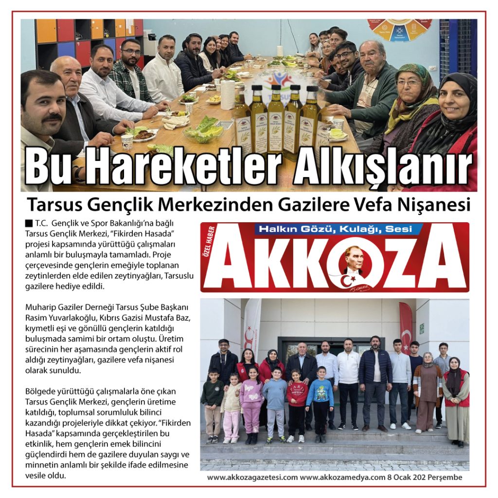 Gençlik ve Spor Bakanlığı’na bağlı Tarsus Gençlik Merkezi, “Fikirden Hasada” projesi kapsamında yürüttüğü çalışmaları anlamlı bir buluşmayla tamamladı. Proje çerçevesinde gençlerin emeğiyle toplanan zeytinlerden elde edilen zeytinyağları, Tarsuslu gazilere hediye edildi.