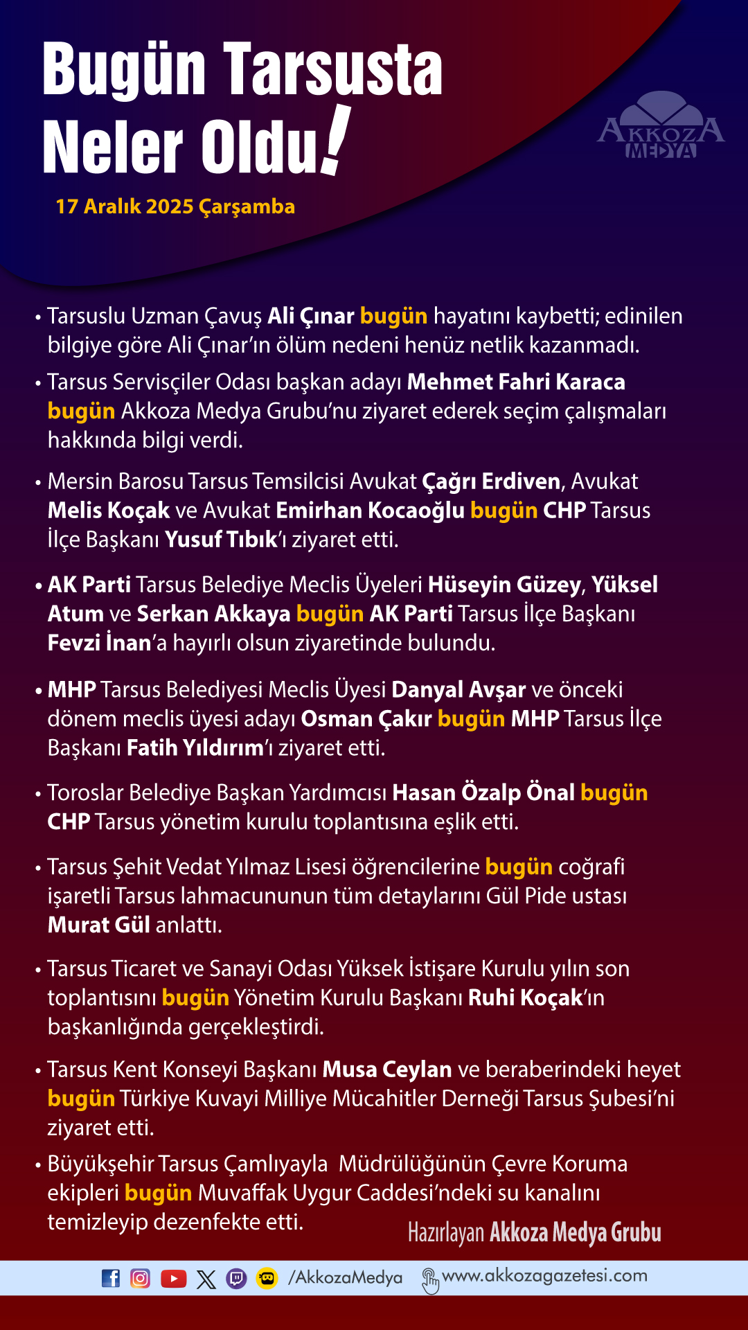 Bugün Tarsus’ta Neler Oldu. 17 Aralık 2025 Çarşamba