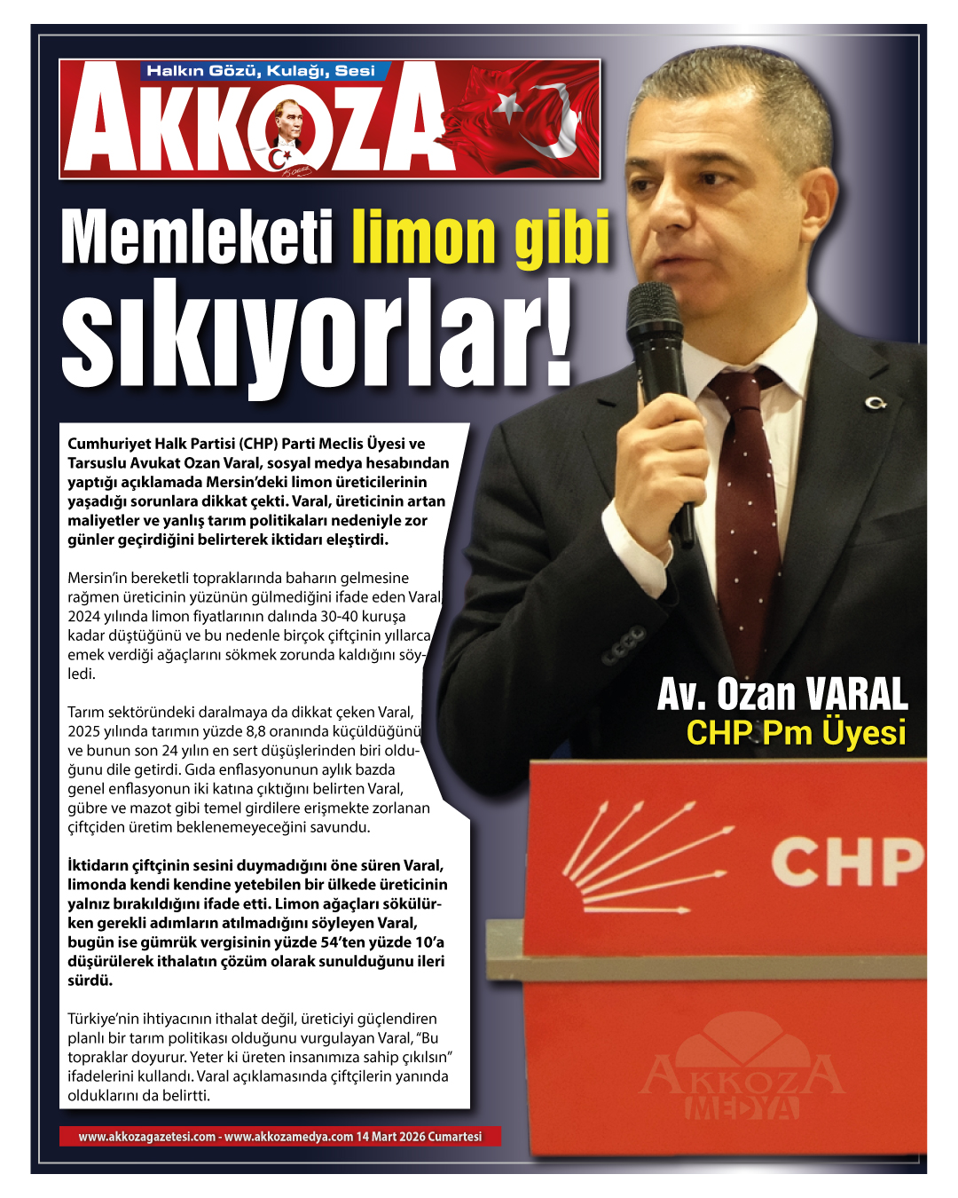 Cumhuriyet Halk Partisi (CHP) Parti Meclis Üyesi ve Tarsuslu Avukat Ozan Varal, sosyal medya hesabından yaptığı açıklamada Mersin’deki limon üreticilerinin yaşadığı sorunlara dikkat çekti. Varal, üreticinin artan maliyetler ve yanlış tarım politikaları nedeniyle zor günler geçirdiğini belirterek iktidarı eleştirdi.
