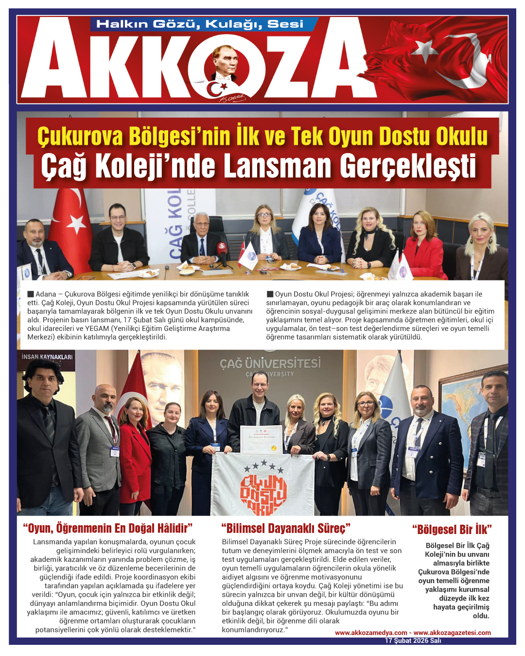 Çağ Koleji’nin bu unvanı almasıyla birlikte Çukurova Bölgesi’nde oyun temelli öğrenme yaklaşımı kurumsal düzeyde ilk kez hayata geçirilmiş oldu.