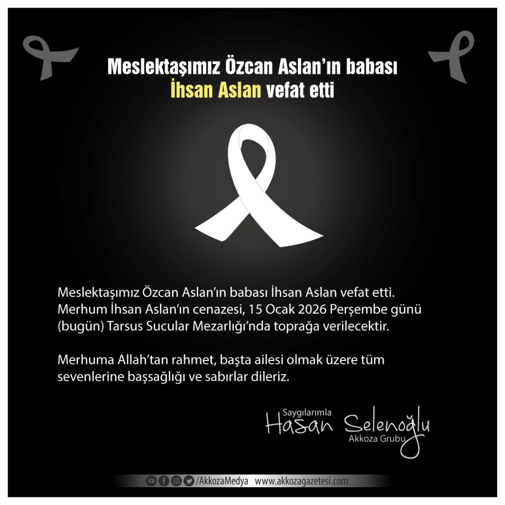 Merhum İhsan Aslan’ın cenazesi, 15 Ocak 2026 Perşembe günü (bugün) Tarsus Sucular Mezarlığı’nda toprağa verilecektir.