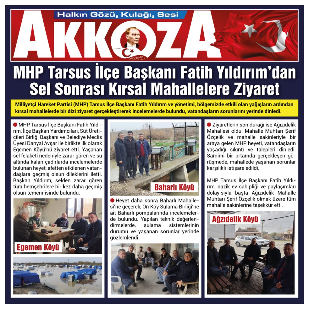 Milliyetçi Hareket Partisi (MHP) Tarsus İlçe Başkanı Fatih Yıldırım ve yönetimi, bölgemizde etkili olan yağışların ardından kırsal mahallelerde bir dizi ziyaret gerçekleştirerek incelemelerde bulundu, vatandaşların sorunlarını yerinde dinledi.