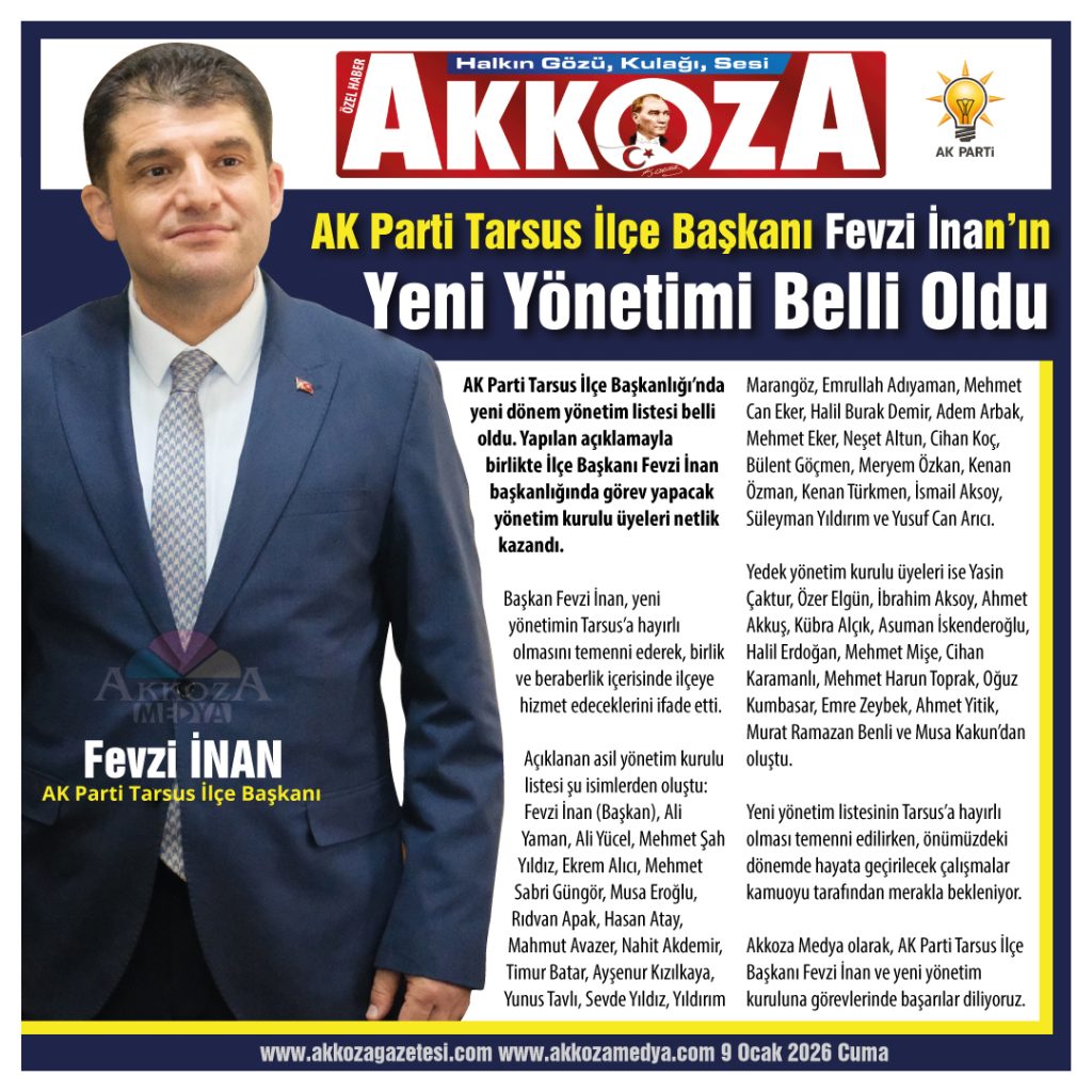Akkoza Medya olarak, AK Parti Tarsus İlçe Başkanı Fevzi İnan ve yeni yönetim kuruluna görevlerinde başarılar diliyoruz.