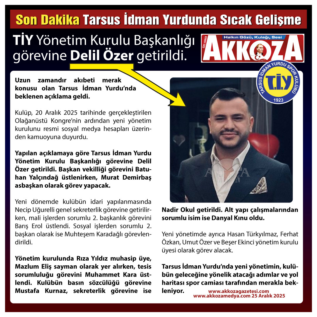 Uzun zamandır akıbeti merak konusu olan Tarsus İdman Yurdu’nda beklenen açıklama geldi. Kulüp, 20 Aralık 2025 tarihinde gerçekleştirilen Olağanüstü Kongre’nin ardından yeni yönetim kurulunu resmi sosyal medya hesapları üzerinden kamuoyuna duyurdu. Yapılan açıklamaya göre Tarsus İdman Yurdu Yönetim Kurulu Başkanlığı görevine Delil Özer getirildi.