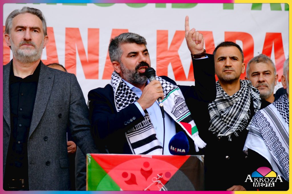Yarenlik Alanı’nda devam eden programda Kur’an-ı Kerim tilaveti gerçekleştirildi. Ardından platform temsilcileri tarafından selamlama konuşmaları yapıldı. Programda konuşan HÜDA-PAR Mersin Milletvekili Faruk Dinç, Filistin halkının yanında olduklarını vurgulayarak, birlik ve dayanışmanın önemine dikkat çekti.