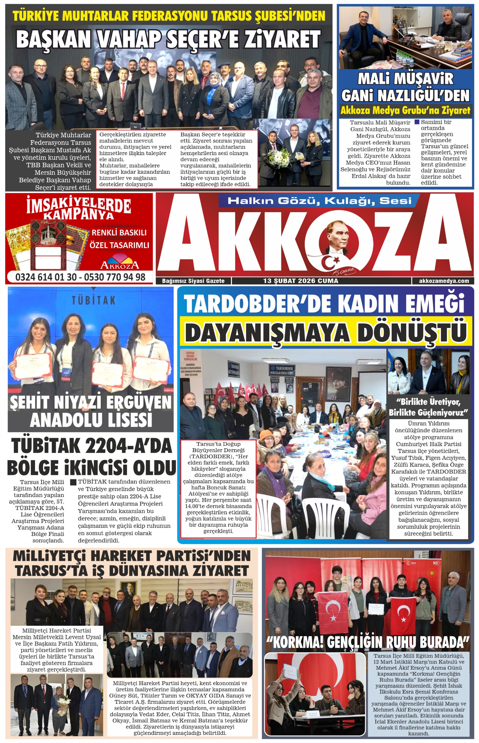 Tarsus Basını Akkoza Gazetesi 13 Şubat 2026 Cuma