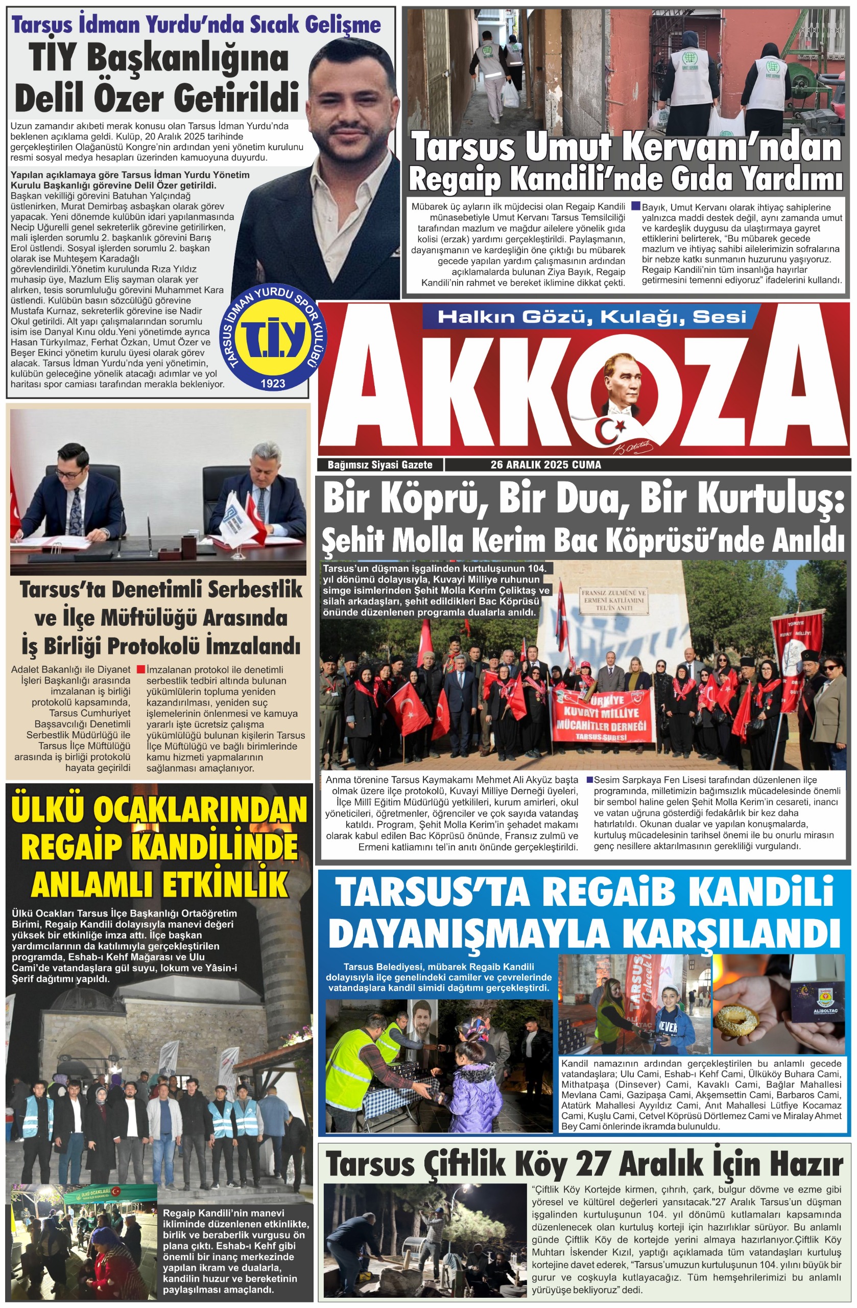 Tarsus Basını Akkoza Gazetesi 25 Aralık 2025 Cuma