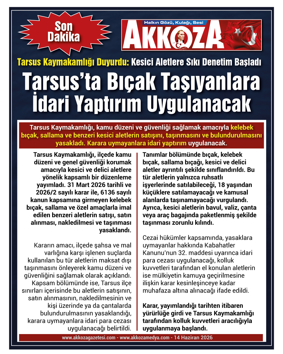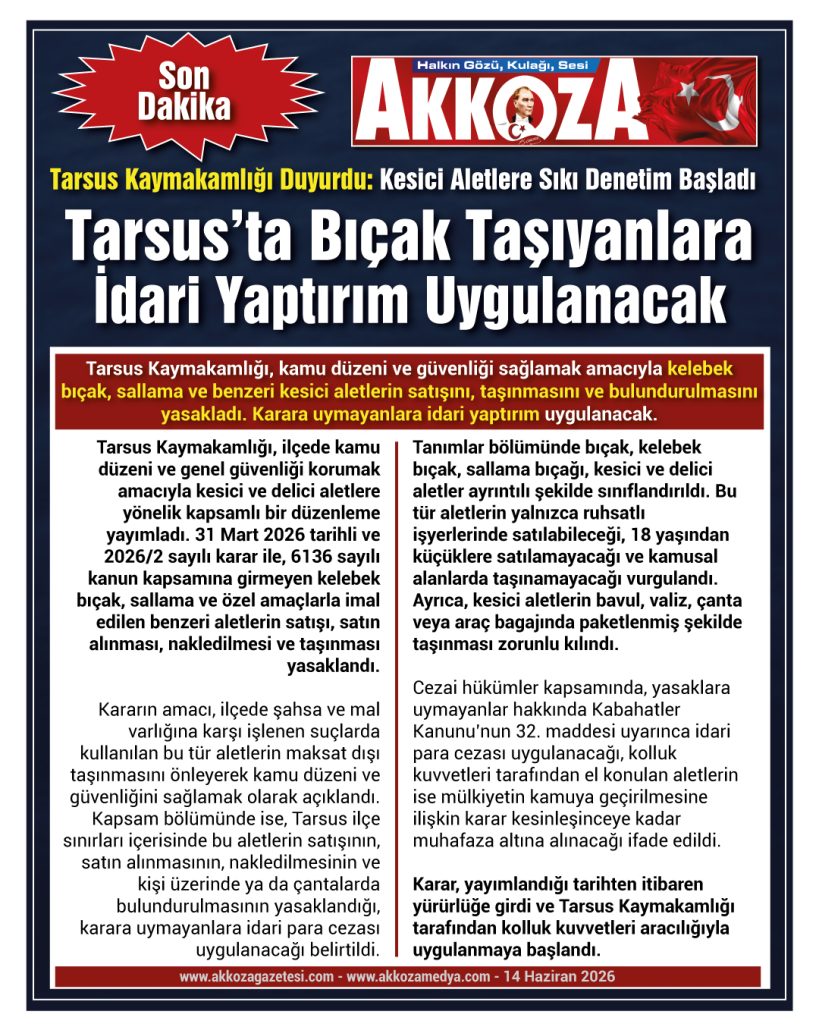 Tarsus Kaymakamlığı, ilçede kamu düzeni ve genel güvenliği korumak amacıyla kesici ve delici aletlere yönelik kapsamlı bir düzenleme yayımladı. 31 Mart 2026 tarihli ve 2026/2 sayılı karar ile, 6136 sayılı kanun kapsamına girmeyen kelebek bıçak, sallama ve özel amaçlarla imal edilen benzeri aletlerin satışı, satın alınması, nakledilmesi ve taşınması yasaklandı.