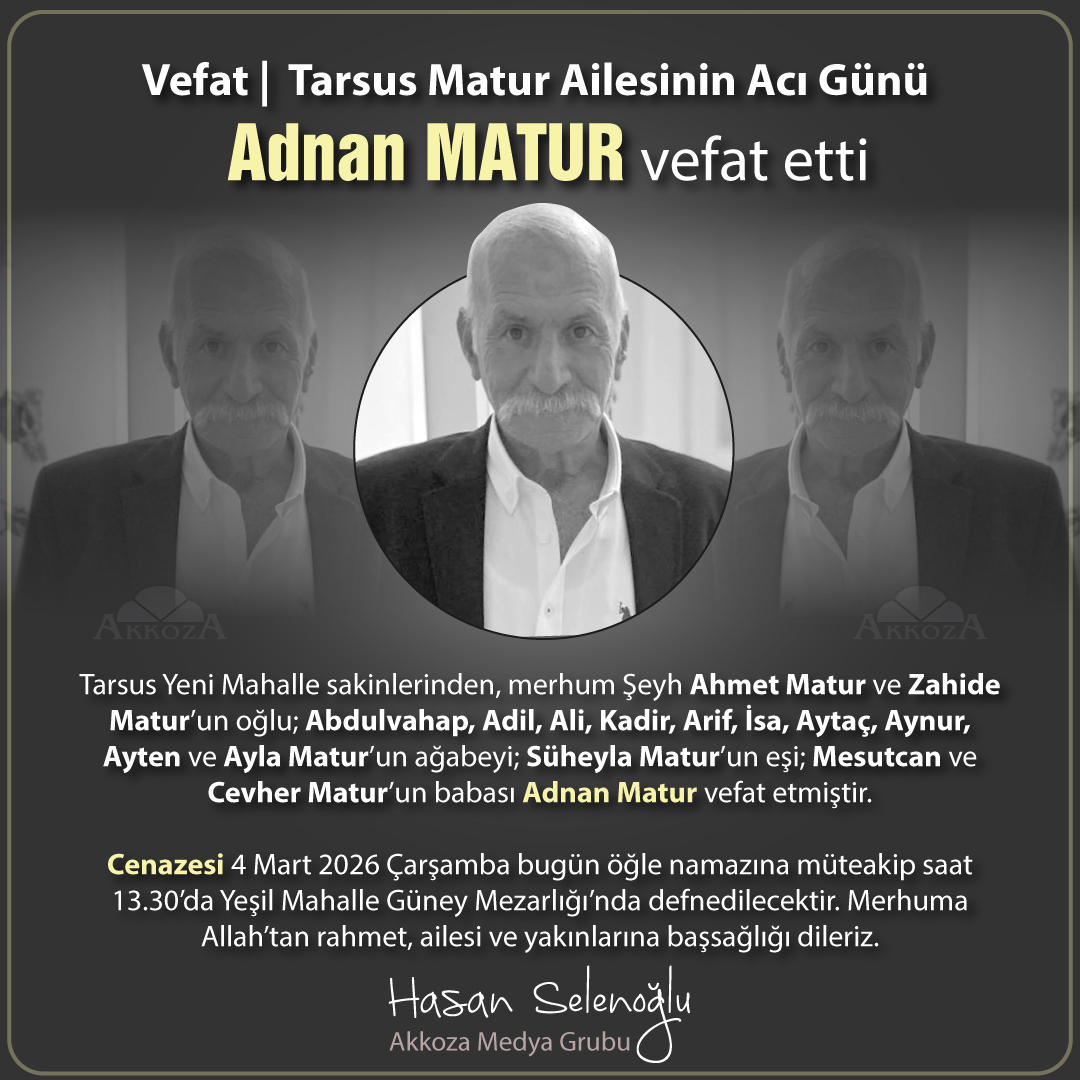 Vefat | Tarsus Yeni Mahalle sakinlerinden, merhum Şeyh Ahmet Matur ve Zahide Matur’un oğlu; Abdulvahap, Adil, Ali, Kadir, Arif, İsa, Aytaç, Aynur, Ayten ve Ayla Matur’un ağabeyi; Süheyla Matur’un eşi; Mesutcan ve Cevher Matur’un babası Adnan Matur vefat etmiştir.