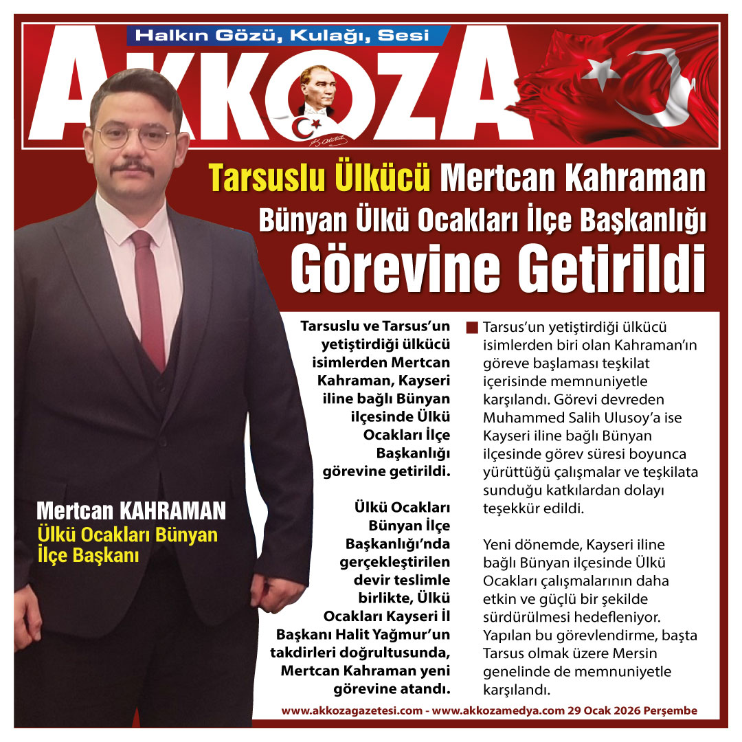 Tarsuslu ve Tarsus’un yetiştirdiği ülkücü isimlerden Mertcan Kahraman, Kayseri iline bağlı Bünyan ilçesinde Ülkü Ocakları İlçe Başkanlığı görevine getirildi.