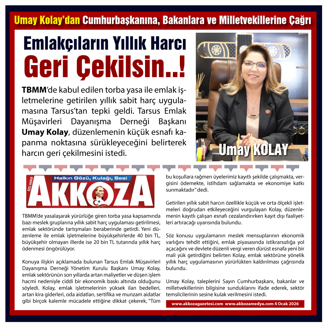 Tarsuslu Umay Kolay’dan Cumhurbaşkanına, Bakanlara ve Milletvekillerine Çağrı: "Emlakçıların Yıllık Harcı Geri Çekilsin!"