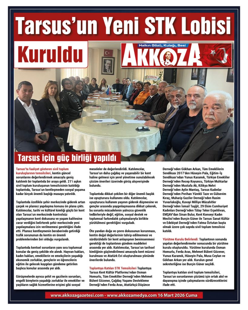 Öte yandan doğa ve çevre dokusunun korunması, kentin doğal değerlerinin tahrip edilmemesi ve sürdürülebilir bir kent anlayışının benimsenmesi gerektiği de toplantının gündem maddeleri arasında yer aldı. Katılımcılar, Tarsus’un tarihsel kimliğinin güçlendirilmesi amacıyla kent müzesi kurulması ve Atatürk Evi oluşturulması yönünde önerilerde bulundu.