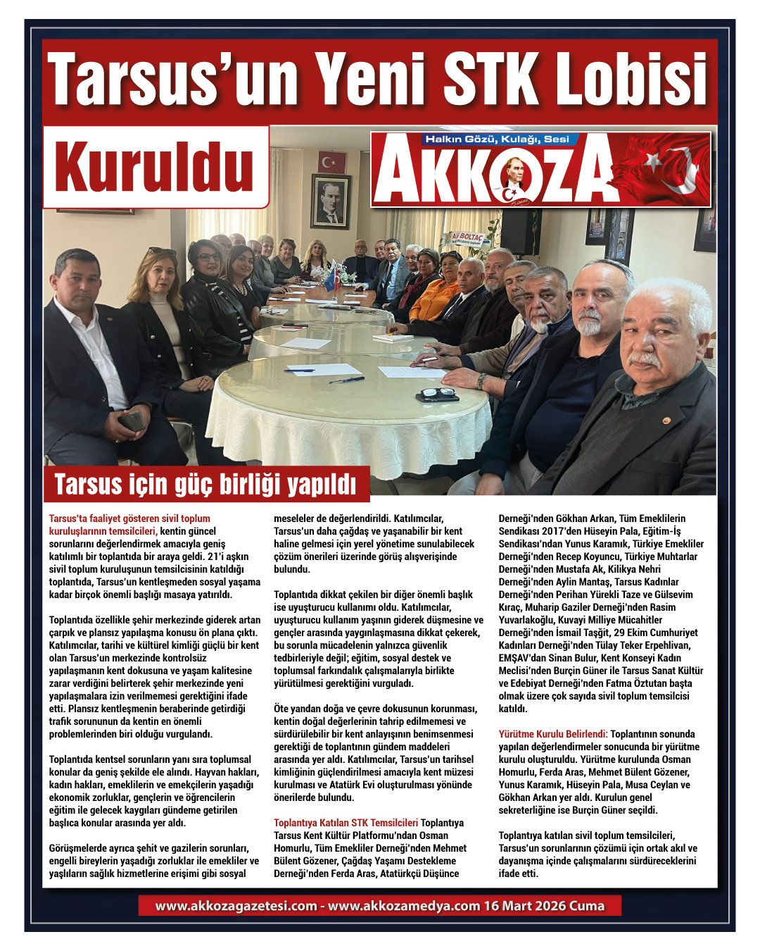 Toplantıya katılan sivil toplum temsilcileri, Tarsus’un sorunlarının çözümü için ortak akıl ve dayanışma içinde çalışmalarını sürdüreceklerini ifade etti.