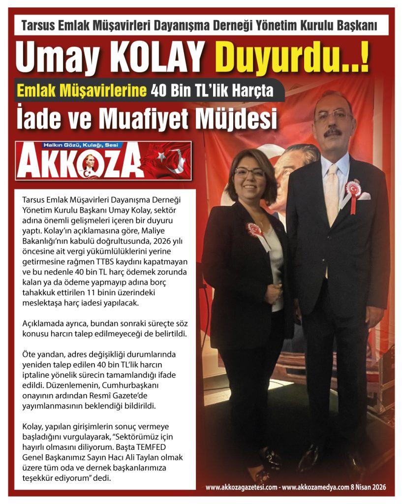 Tarsus Emlak Müşavirleri Dayanışma Derneği Yönetim Kurulu Başkanı Umay Kolay, sektör adına önemli gelişmeleri içeren bir duyuru yaptı. Kolay’ın açıklamasına göre, Maliye Bakanlığı’nın kabulü doğrultusunda, 2026 yılı öncesine ait vergi yükümlülüklerini yerine getirmesine rağmen TTBS kaydını kapatmayan ve bu nedenle 40 bin TL harç ödemek zorunda kalan ya da ödeme yapmayıp adına borç tahakkuk ettirilen 11 binin üzerindeki meslektaşa harç iadesi yapılacak.