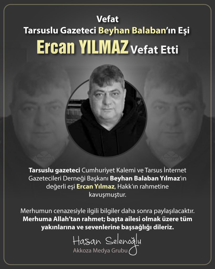 Tarsuslu gazeteci, Tarsus Cumhuriyet Kalemi ve Tarsus İnternet Gazetecileri Derneği Başkanı Beyhan Balaban Yılmaz’ın değerli eşi Ercan Yılmaz, Hakk’ın rahmetine kavuşmuştur.