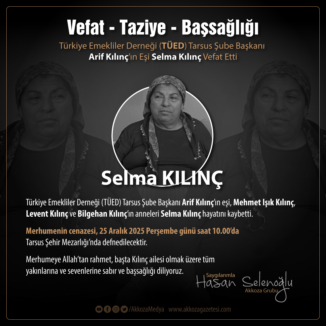 Merhumenin cenazesi, 25 Aralık 2025 Perşembe günü saat 10.00’da Tarsus Şehir Mezarlığı’nda defnedilecektir.