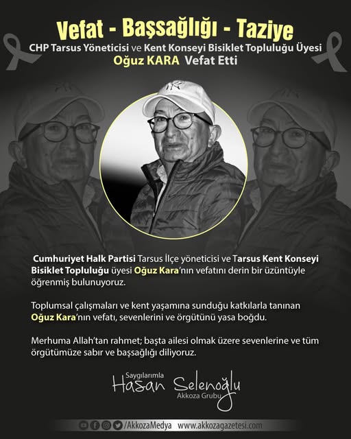 Cumhuriyet Halk Partisi Tarsus İlçe yöneticisi ve Tarsus Kent Konseyi Bisiklet Topluluğu üyesi Oğuz Kara’nın vefatını derin bir üzüntüyle öğrenmiş bulunuyoruz.