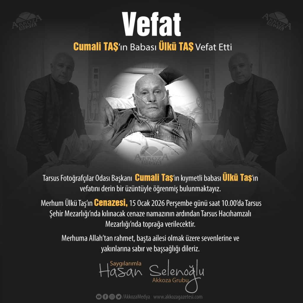 Merhum Ülkü Taş’ın cenazesi, 15 Ocak 2026 Perşembe günü saat 10.00’da Tarsus Şehir Mezarlığı’nda kılınacak cenaze namazının ardından Tarsus Hacıhamzalı Mezarlığı’nda toprağa verilecektir. Merhuma Allah’tan rahmet, başta ailesi olmak üzere sevenlerine ve yakınlarına sabır ve başsağlığı dileriz.