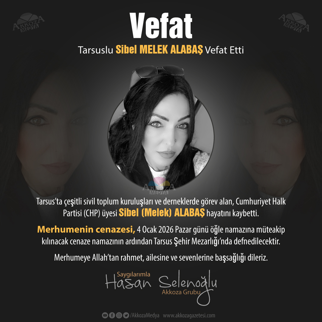 Merhumenin cenazesi, 4 Ocak 2026 Pazar günü öğle namazına müteakip kılınacak cenaze namazının ardından Tarsus Şehir Mezarlığı’nda defnedilecektir. Merhumeye Allah’tan rahmet, ailesine ve sevenlerine başsağlığı dileriz.