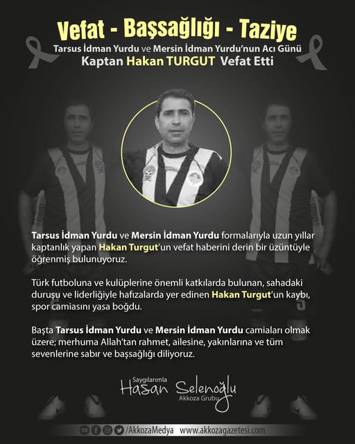 Tarsus İdman Yurdu ve Mersin İdman Yurdu formalarıyla uzun yıllar kaptanlık yapan Hakan Turgut’un vefat haberini derin bir üzüntüyle öğrenmiş bulunuyoruz.