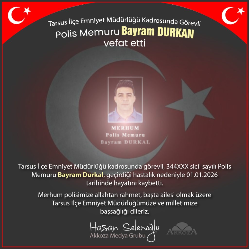 Tarsus İlçe Emniyet Müdürlüğü kadrosunda görevli, 344XXX sicil sayılı Polis Memuru Bayram Durkal, geçirdiği hastalık nedeniyle 01.01.2026 tarihinde hayatını kaybetti.