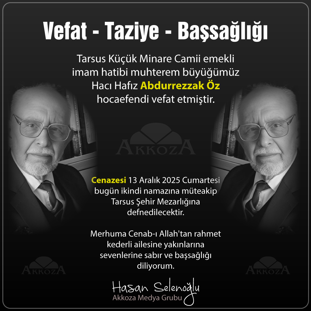 Cenazesi 13 Aralık 2025 Cumartesi bugün ikindi namazına müteakip Tarsus Şehir Mezarlığına defnedilecektir. Merhuma Cenab-ı Allah'tan rahmet kederli ailesine yakınlarına sevenlerine sabır ve başsağlığı diliyorum.